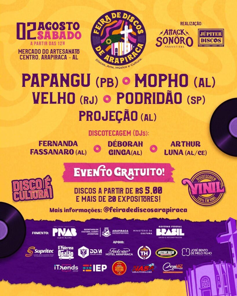 Além das apresentações, a Feira de Discos este ano contará com uma estrutura de acessibilidade, com intérprete de Libras e sinalização em braille nas banquinhas. A feira é viabilizada com recursos da Lei Aldir Blanc, do Governo Federal, e tem apoio da Prefeitura de Arapiraca, por meio da Secretaria de Cultura, Lazer e Juventude.