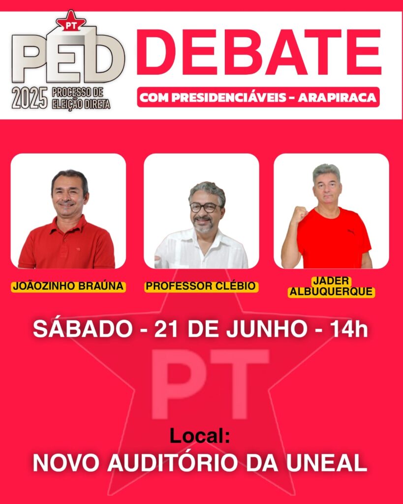 O debate deve contar com a participação dos candidatos Joãozinho Braúna, atual presidente municipal do partido e que busca à reeleição; Professor Clébio e Jade Albuquerque. Como legenda com forte posição democrática, o PT em Alagoas conta com várias correntes políticas, o que torna a disputa ainda mais acirrada e retoma o fortalecimento nacional com vistas às eleições gerais de 2026, mobilizado principalmente pelo retorno de Lula da Silva à presidência do Brasil para o terceiro mandato no Executivo.