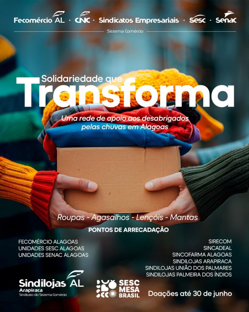 Com a chegada do inverno, período marcado pelas fortes chuvas e queda nas temperaturas, o Sistema Fecomércio-Sesc-Senac, em parceria com os sindicatos empresariais, lançou campanha “Solidariedade que Transforma”. O Sindilojas Arapiraca, que todos os anos promove campanha de doações de agasalhos e cobertores para pessoas em situação de vulnerabilidade, abraçou a iniciativa e se tornou um ponto de arrecadação.