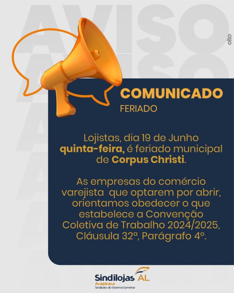 À população de Arapiraca, o Sindilojas informa que, tanto no feriado de Corpus Christi quanto no Dia do Comerciário, boa parte do comércio no centro da cidade permanece fechado. No entanto, estabelecimentos de grandes redes varejistas, supermercados, restaurantes, padarias e comércios de bairro costumam manter o funcionamento.